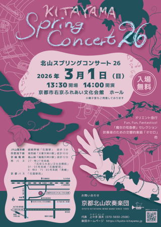 定期演奏会 「北山スプリングコンサート 26」 (主 催) 京都北山吹奏楽団 (場 所) 京都市右京ふれいあい文化会館 ホール (時 間) 13時30分 開場、14時00分 開演 (入場料) 無料 (演奏曲) オリエント急行 Fun, Fun, Fantastico! 「魔女の宅急便」セレクション 吹奏楽のための交響的素描「オセロ」 他 |